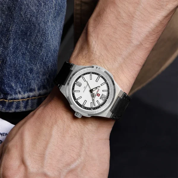 Naviforce 9233 Leather Wrist Watch For Men- Black White