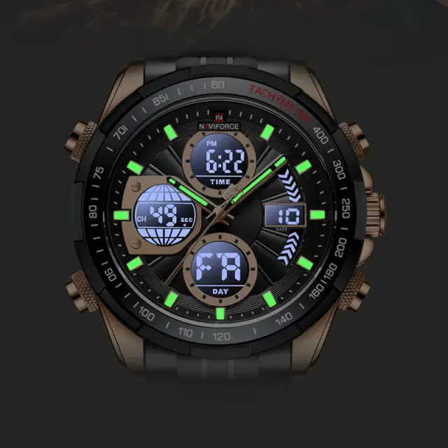 â—‰ Features: Stainless steel back cover, two-color 45 mm zinc alloy shell, hardened mineral glass crystal luminous hands, LED backlit dial, chronograph dual-time alarm clock SIG snooze function, and display specific hours, minutes, seconds, days, months and weeks;